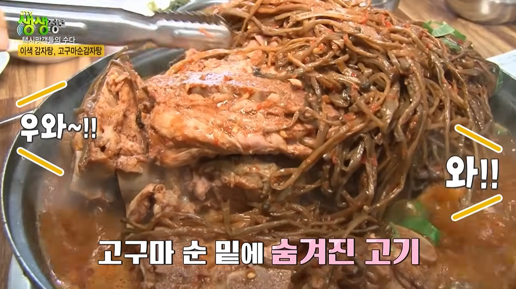 네 번째는 '고구마순 감자탕'. 시래기 대신 고구마순을 넣어 쫄깃한 식감을 더한 감자탕으로, 돼지 잡내를 없애기 위해 고추와 청양고추를 다려 만든 순수 양념이 핵심이다.