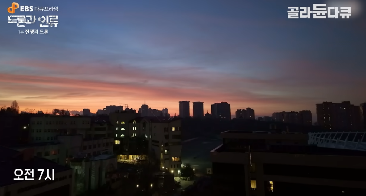 우크라이나의 수도 키이우. 이곳에서 시작된 다큐멘터리는 드론이 일상이 된 전쟁의 실체를 생생히 담아냅니다. 새벽, 호텔 창밖으로 보인 건 불꽃놀이가 아닌 방공망의 요란한 섬광. 제작진은 폭격을 피해 대피소로 이동하고, 곧이어 건물 화재 현장을 따라 나섭니다.